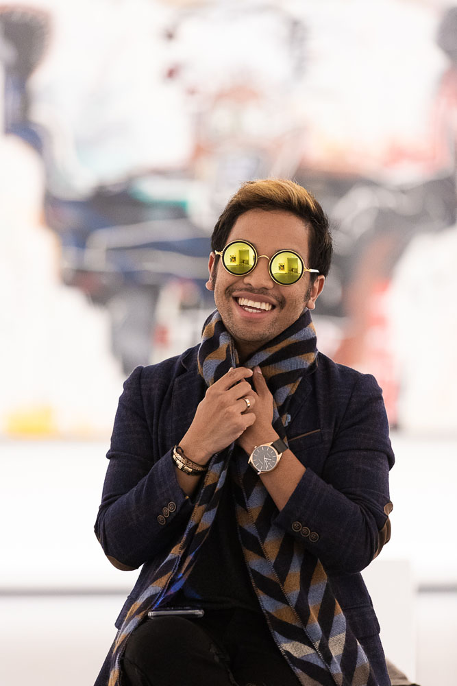 Contributeur photo Jeremy Guetté Veste & pantalon Zara -Écharpe Saint-Hilaire – Lunettes Vintage -Montre Bering – Bracelets Bvlgari & Louis Vuitton – Loafers Maison Galet – Sac Kenzo