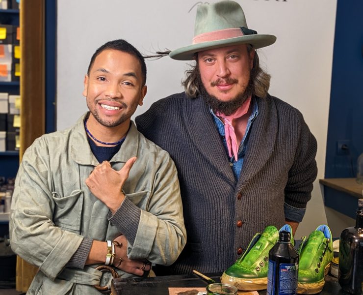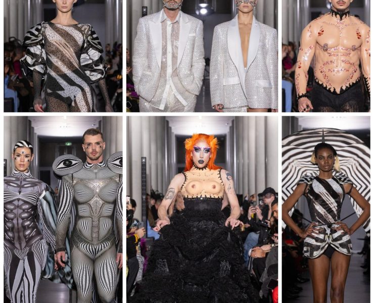 Fabriqués à partir des matières premières des anciennes collections de Collina Strada, la créatrice Hillary Taymour a imaginé plusieurs modèles également. Dont celui aux motifs imprimés, et relié par des noeuds, à la droite au niveau des oreilles, et au niveau du cou sur le côté gauche.