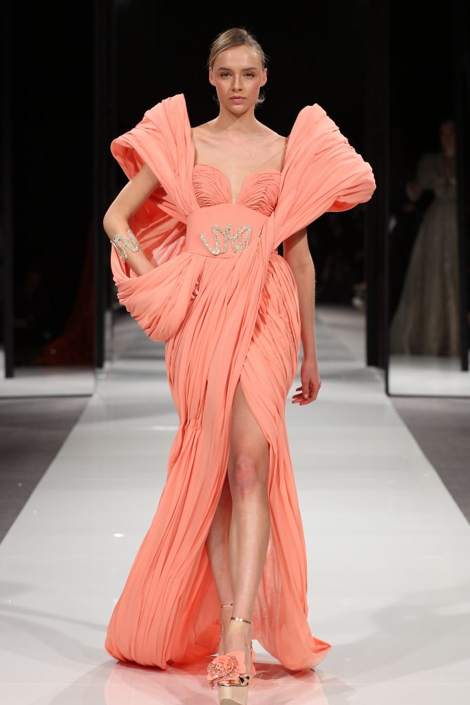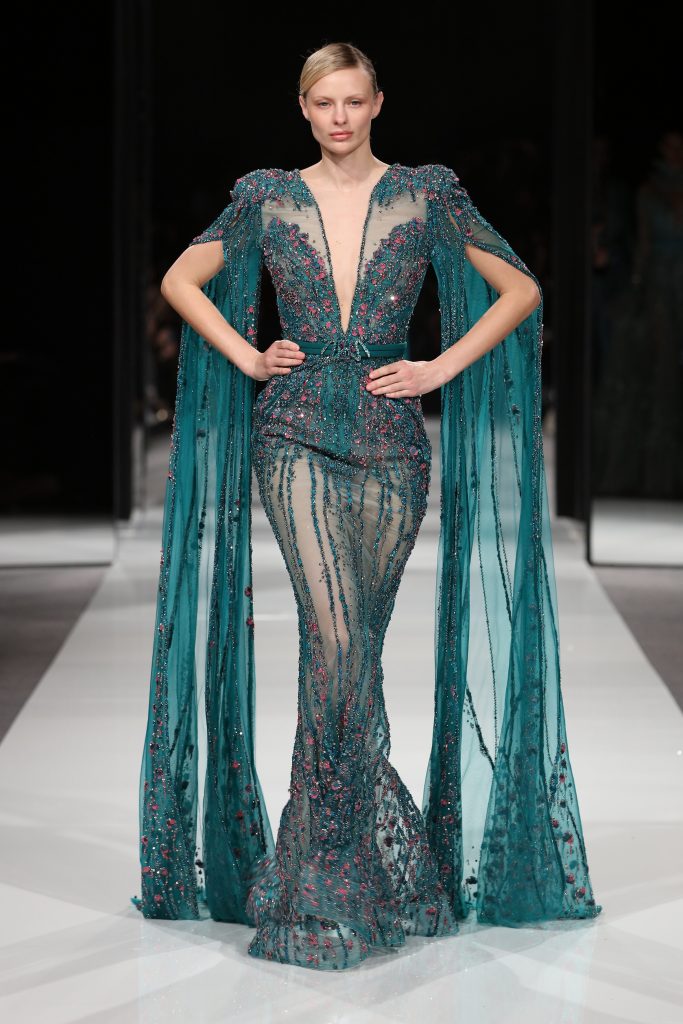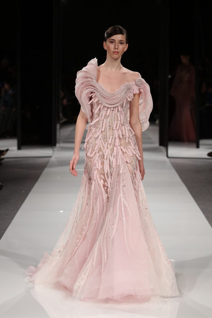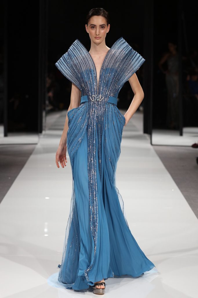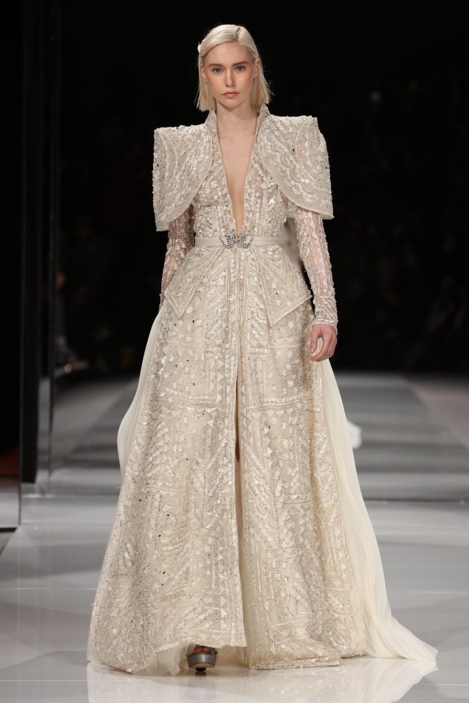 Si on regarde de plus près, les pièces sont architecturées, les tailles marquées, les épaules ajustées. Mais adoucies par des manches volumineuses ou ultra longues. Enfin, le côté architectural est accentué par le travail de broderies réalisées à la main dans les ateliers du couturier à Beyrouth.