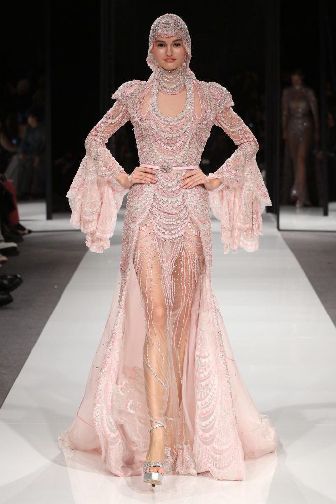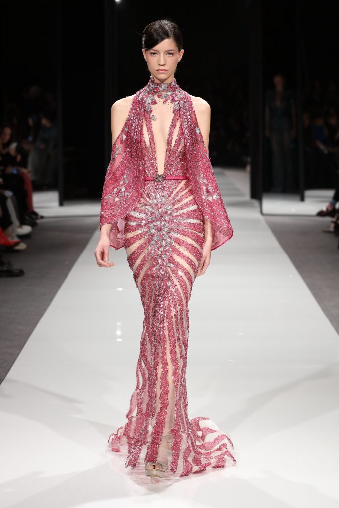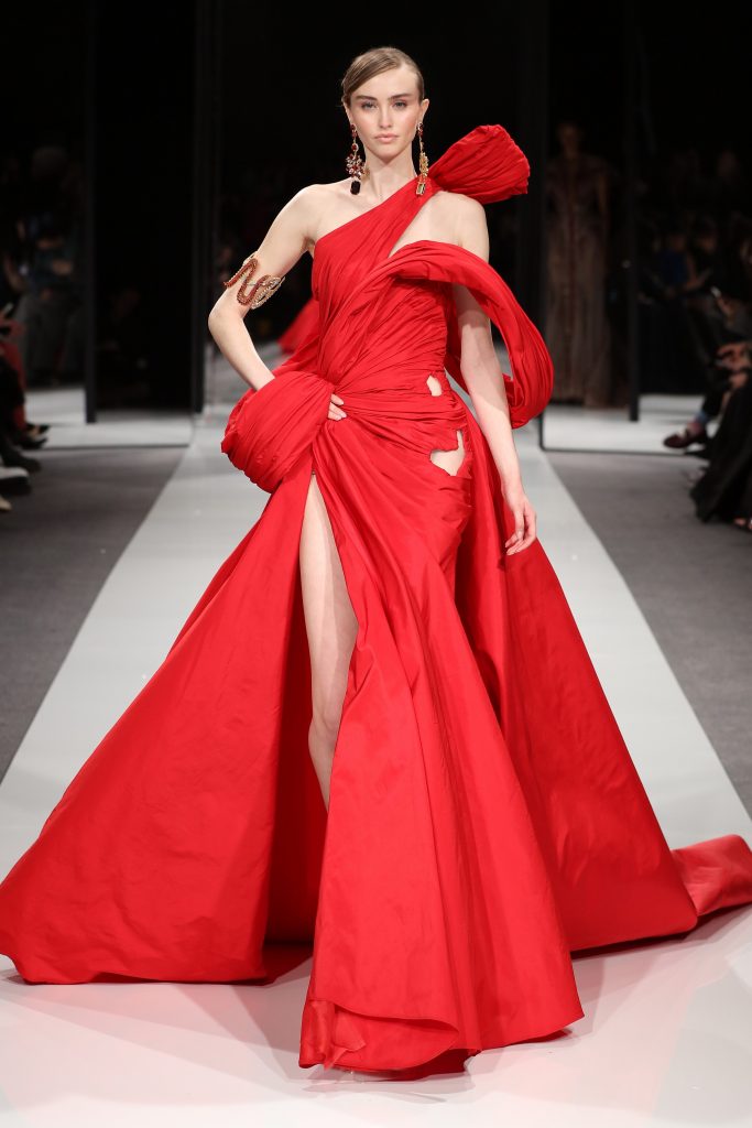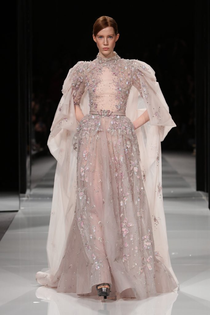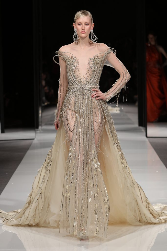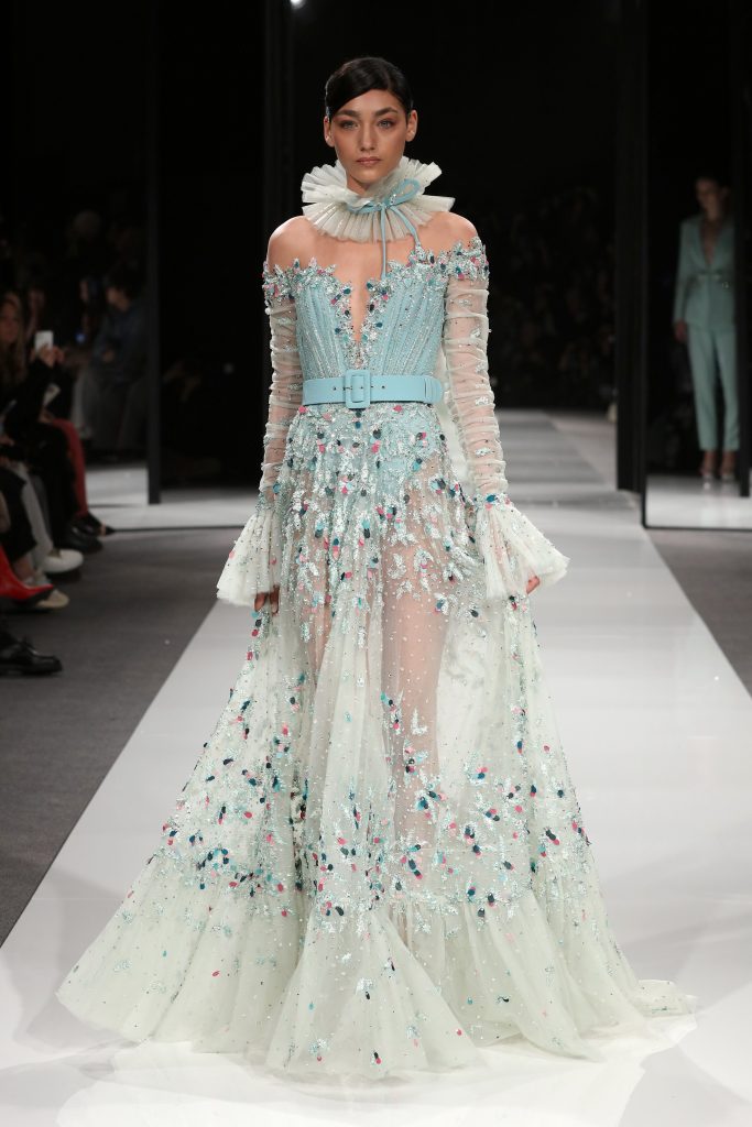 Si on regarde de plus près, les pièces sont architecturées, les tailles marquées, les épaules ajustées. Mais adoucies par des manches volumineuses ou ultra longues. Enfin, le côté architectural est accentué par le travail de broderies réalisées à la main dans les ateliers du couturier à Beyrouth.